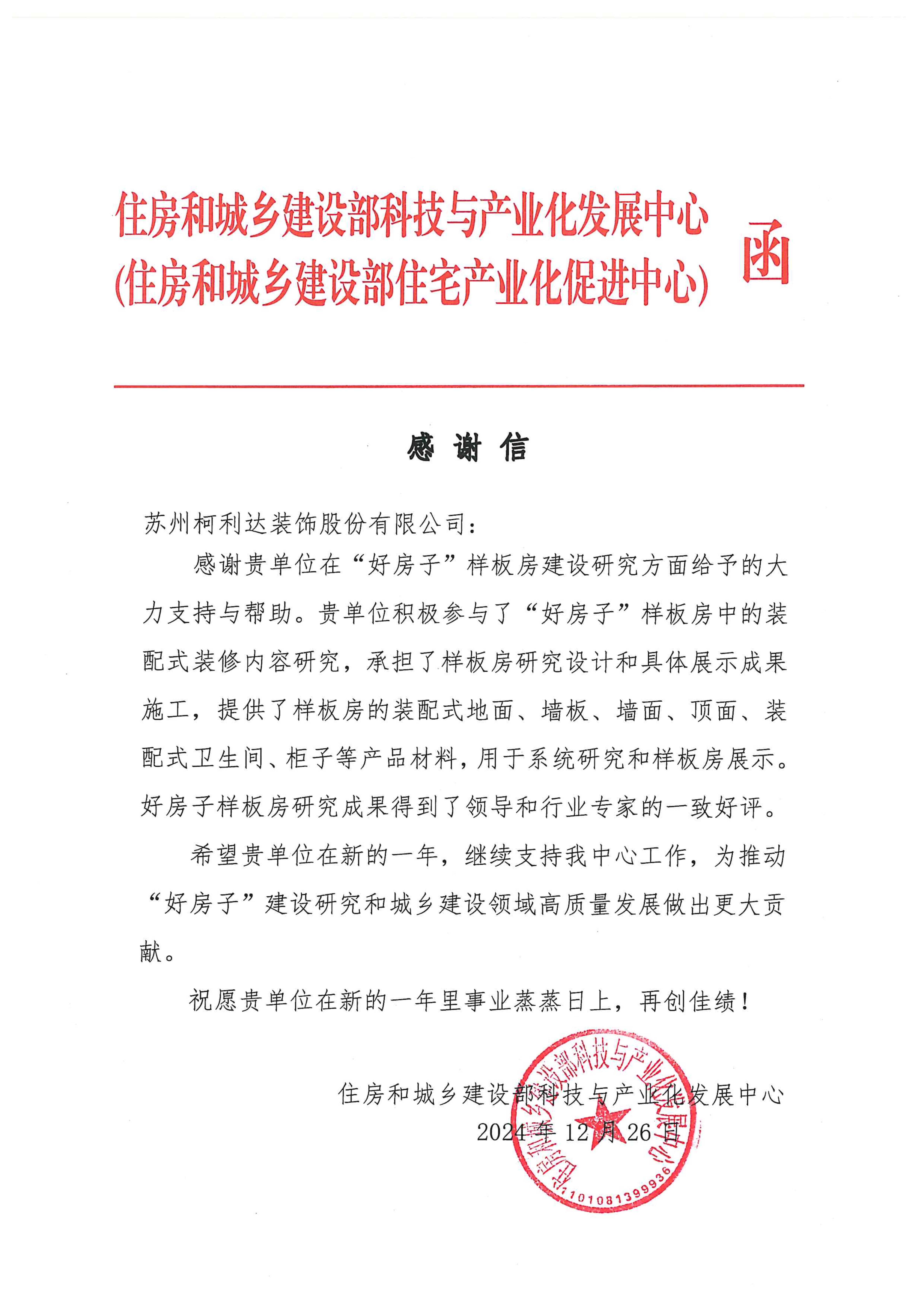 新歲漸近,祥光煥彩。在辭舊迎新之際,柯利達(dá)收到來(lái)自住房和城鄉(xiāng)建設(shè)部科技與產(chǎn)業(yè)化發(fā)展中心發(fā)來(lái)的感謝信,對(duì)公司在“好房子”樣板房建設(shè)研究方面給予的大力支持與